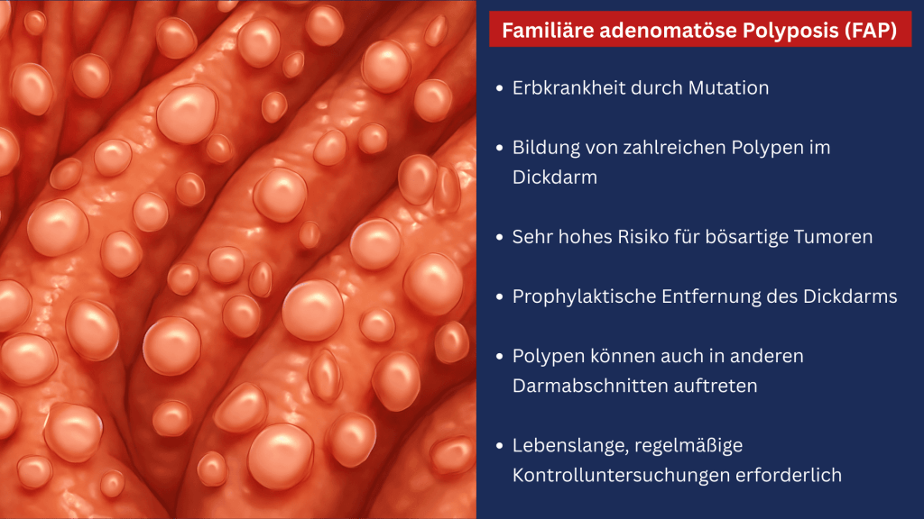 Die familiäre adenomatöse Polyposis ist eine erblich bedingte Erkrankung, bei der im Dickdarm sehr viele Polypen entstehen. Da es sich um eine genetische Erkrankung handelt, ist es wichtig, dass auch enge Angehörige beraten und wenn möglich genetisch getestet werden. Erste Polypen können bereits im Teenageralter auftreten, weshalb die Vorsorge in betroffenen Familien früh beginnt. Durch moderne genetische Diagnostik ist heute eine frühzeitige Erkennung möglich, sodass rechtzeitig mit passenden Untersuchungen und Behandlungsmaßnahmen begonnen werden kann.